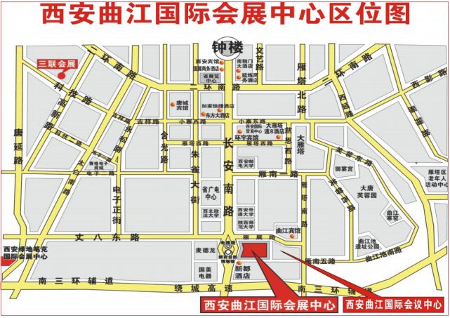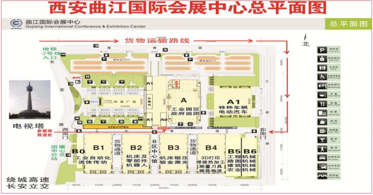 注:曲江国际会展中心:运输车辆经由绕城高速长安立交出口,朝长安路方向北行。行至长安路与雁展路交叉口处向右转,运输车辆从展馆东南门进入展场。